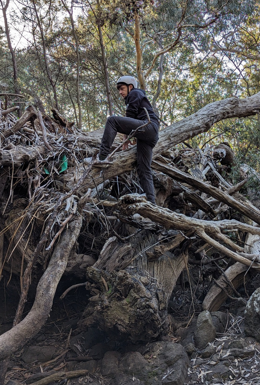 The sculpture features a shovel found by the Werribee River, that almost completely blended into the rocks and rubble, decomposing, unseen. He contrasts this with plastic litter (in the prior form of tree collars and trimmer line) easily found in its stark form, a challenging material to return to the Earth. This was cleaned, heated and reformed, and paired with 150 individually programmed LEDs to create the encroaching form propping up the shovel before you.